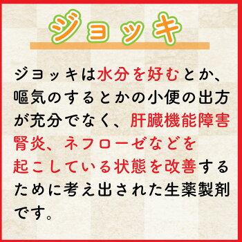 肝臓機能の障害、腎炎などの症状を改善 ジヨッキは水分を好むとか、嘔気のするとかの小便の出方が充分でなく、肝臓機能障害・腎炎・ネフローゼなどを起こしている状態を改善するために考え出された生薬製剤です。