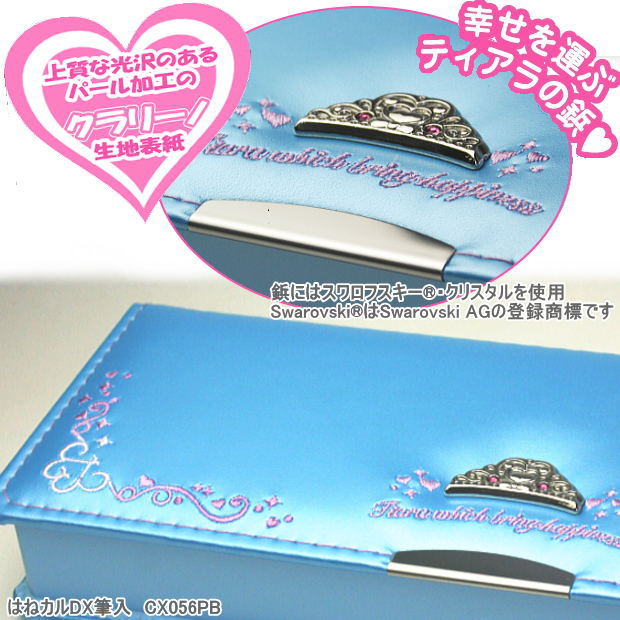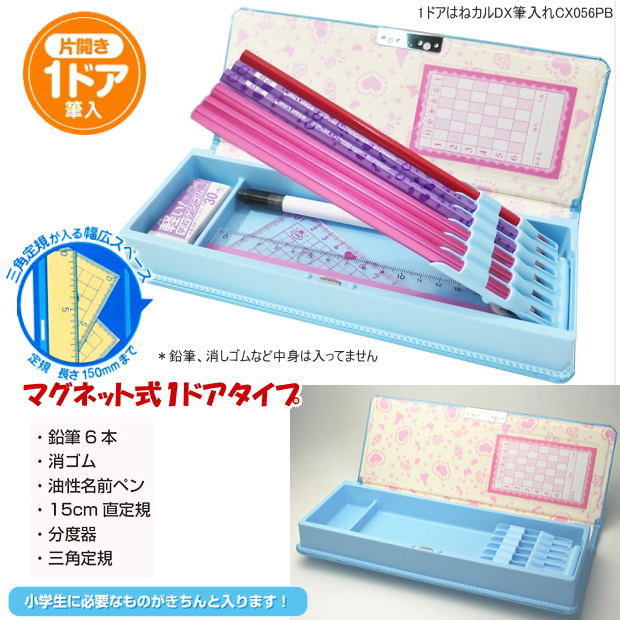 商品名 クラリーノ 筆箱 はねカルDX 筆入れ 1ドア 品番 CX056PB パールブルー サイズ 横9×縦23.8×厚さ3.5cm 重さ:約)135g 仕様 マグネット式1ドアタイプ・巻込表紙 ・安全鉛筆ホルダー(6本) ・定規が入るポケット ・三角定規収納可能・上下段合わせて鉛筆13本収納可能 ・日本製 日本PTA全国協議会推薦 材質 カバー:合皮 人工皮革(クラリーノ)、本体:ABS、鉛筆ホルダー:PE、 メーカー クツワ株式会社 キラキラしたのラメ入り水色の生地にピンクのステッチ おしゃれな女の子むけの筆箱 新入学祝いに人気の筆箱です。